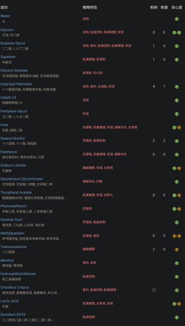 心得:新款乳液我覺得最大重點是移除Isopropyl Palmitate(高刺激性人工合成脂),問