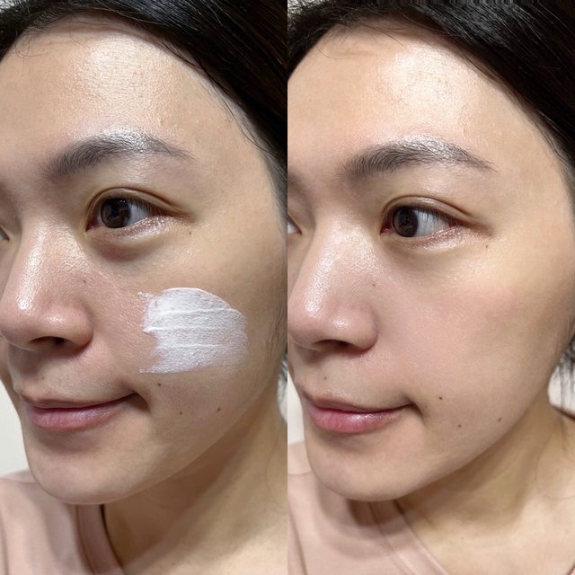 白色質地推勻後會讓皮膚微微明亮、水透感