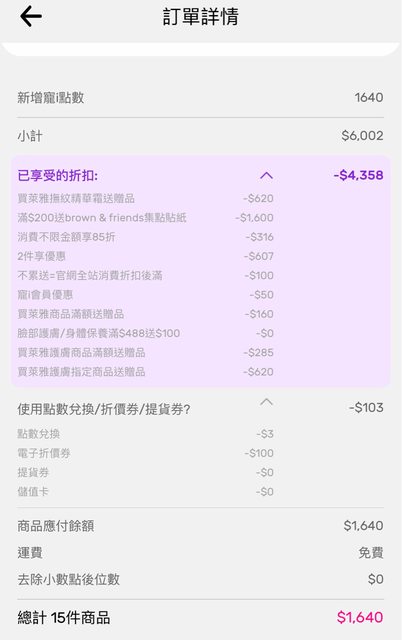 總計:882+762=1644-100(優惠碼)-3(點數)=1541