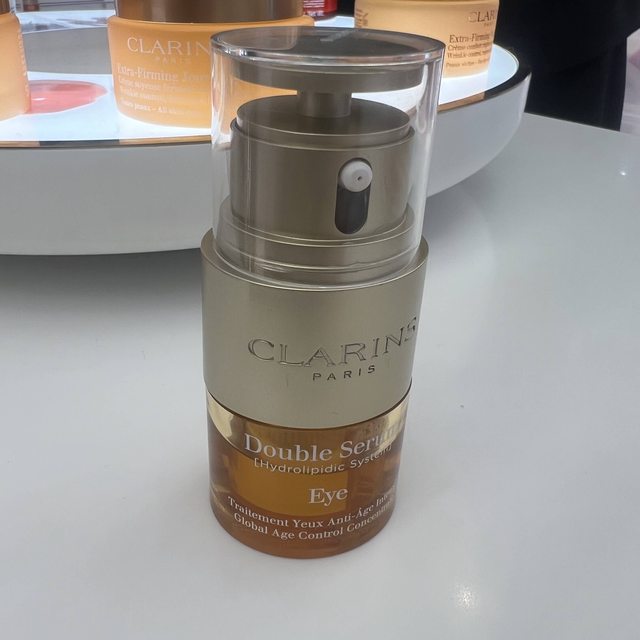 流程一開始先嗅吸芳香噴霧,是熟悉的克蘭詩天然草本味,接著卸妝清潔再開始體驗商品,這次護膚會重點是眼部保養~美容老師知道我平時有用賽車眼霜跟雙激萃的習慣