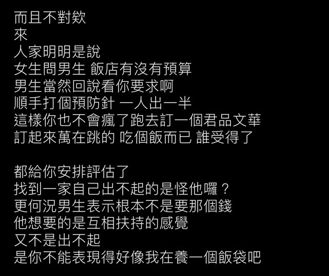 噓 lianli1024 : 今天男生也說除了住宿全包了 只要房錢對半付所以從 08/21 00:20