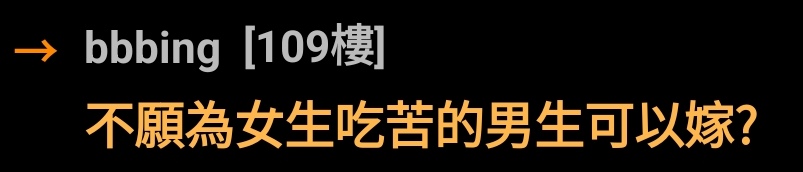 → lpb : 「不願意為男人吃苦的女人可以娶?」 10/05 15:41