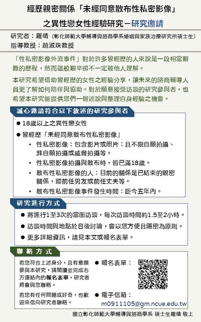 在趙淑珠教授的指導下進行碩士論文研究。本研究主題是「經歷親密關係未經同意散佈性
