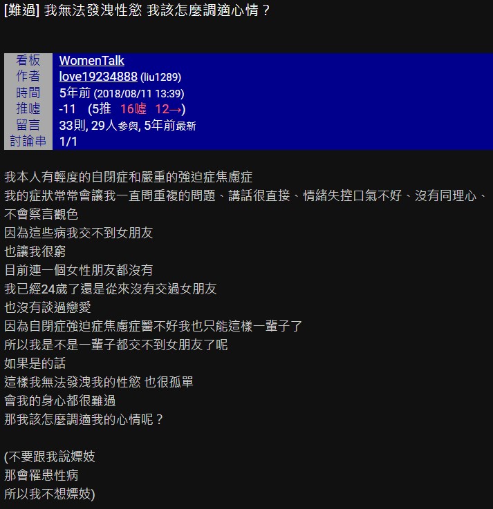 推 hilt : 很多沒有自閉症強迫症躁鬱症的男人也交不到女朋友,05/22 20:47