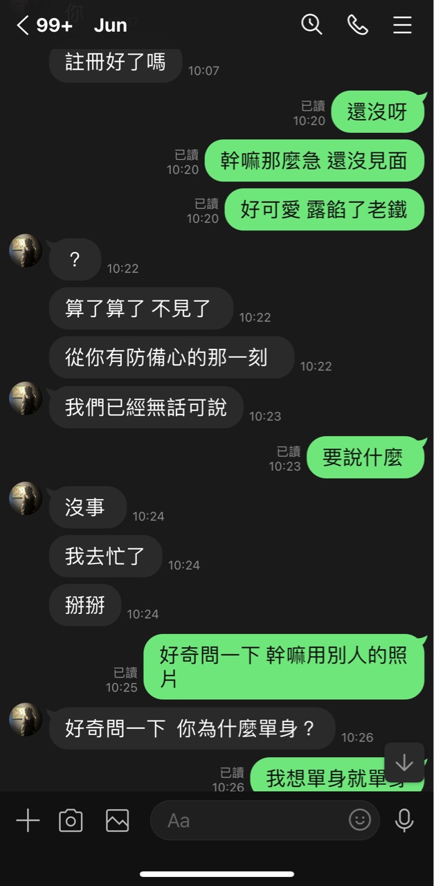 推 Yancy0727 : 你真的有夠閒,玩交友軟體遇到這種立馬解配就好,06/11 13:55