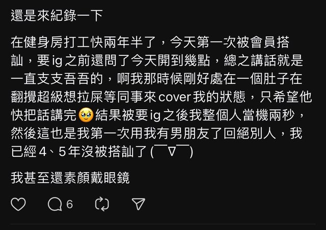 推 winter2683 : 4.5年沒被搭訕 健身房還要作2年半才第一次被要IG 想 07/15 15:16