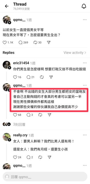 : 就是因為我覺得如果一個女的每餐要你請