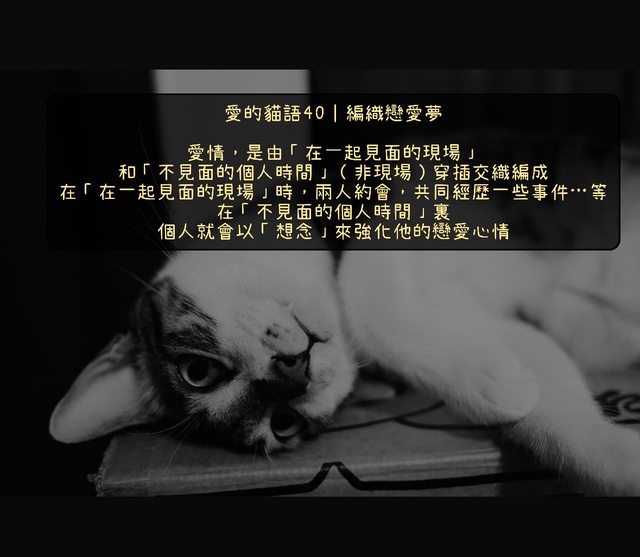 「愛的貓語」是根據心理師近30年的觀察、實務經驗及愛情心理學的研究成果,發展而成的短文,我認為,如果能從01貓語,細細思量貓語,有這個認知及行為,往向順利和諧的戀人乃至於可能未來婚姻之幸福不遠矣!