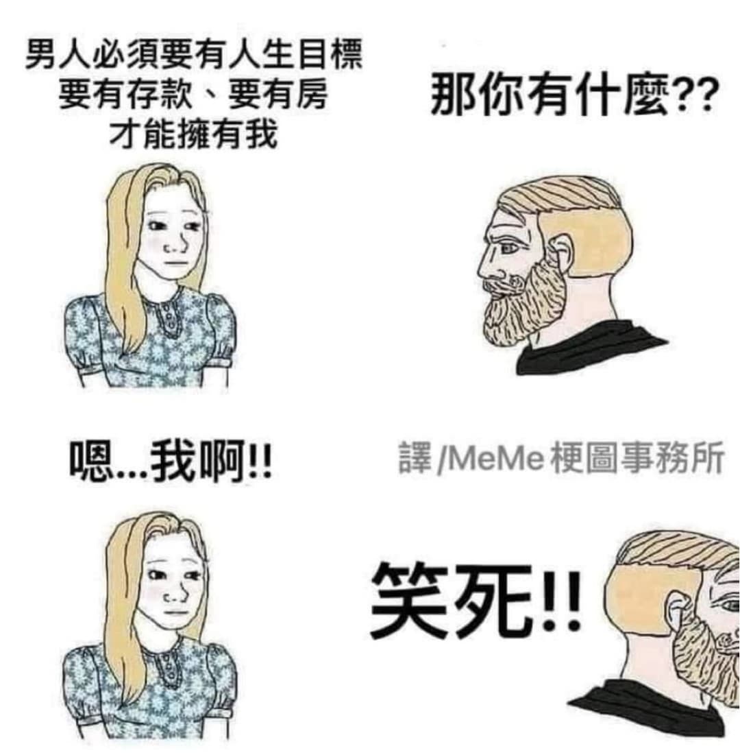 → a96932000 : 股市賠了?另一半斗內罩你;被上司狗幹?另一半說:辭職 10/07 21:51