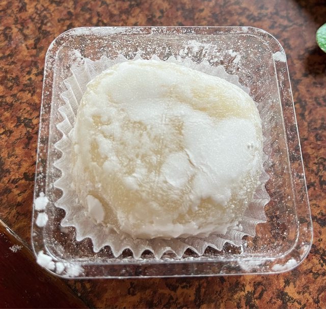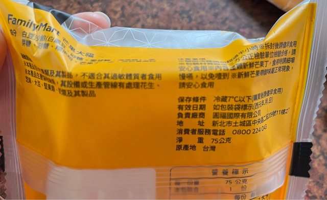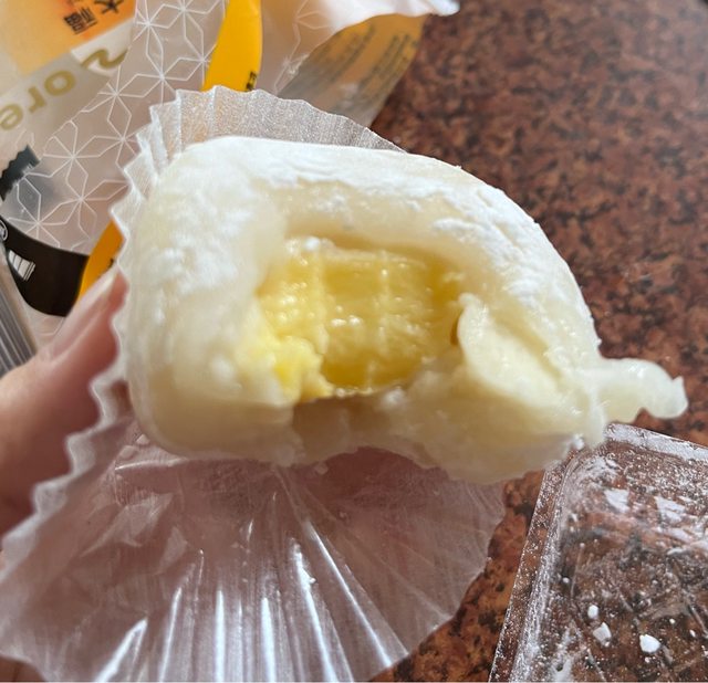 我本來以為內餡是一兩塊芒果丁,旁邊是鮮奶油。結果咬下去咬到豆沙,拿起包裝看了一