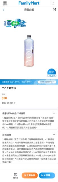 : 【商品名稱/價格】:YOI鹼性水$30(兩件全家可抽獎,我抽到77折)