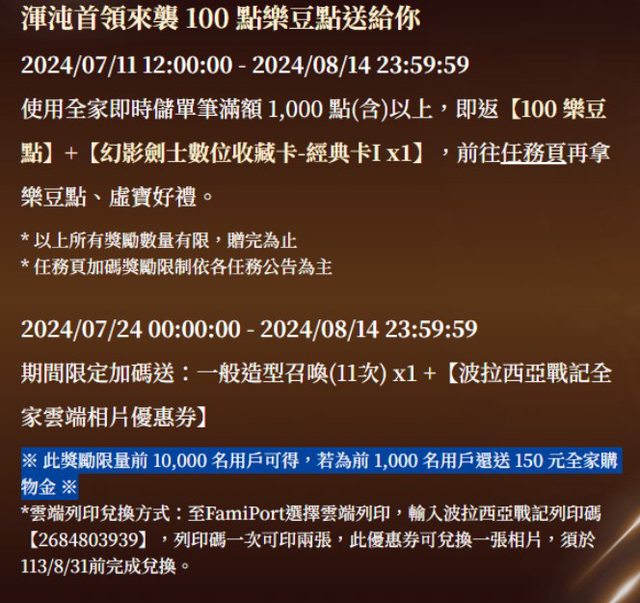 【活動名稱】:波拉西亞戰記 全家即時儲 送150元購物金