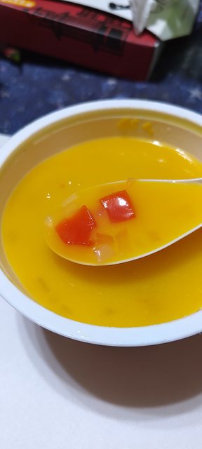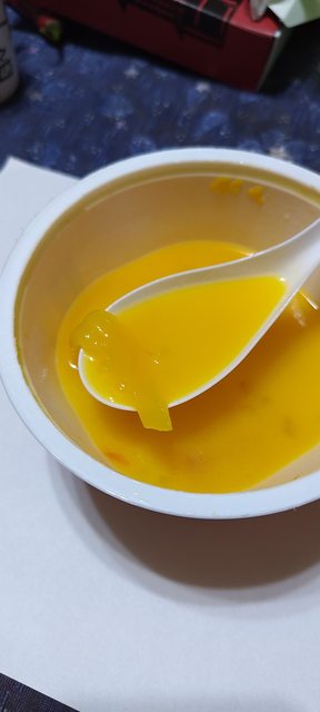口感上有點薄弱,用芒果泥作基底,不會太稀,滿甜的。大部分的口感來源都是紅色椰果還