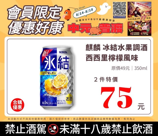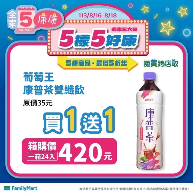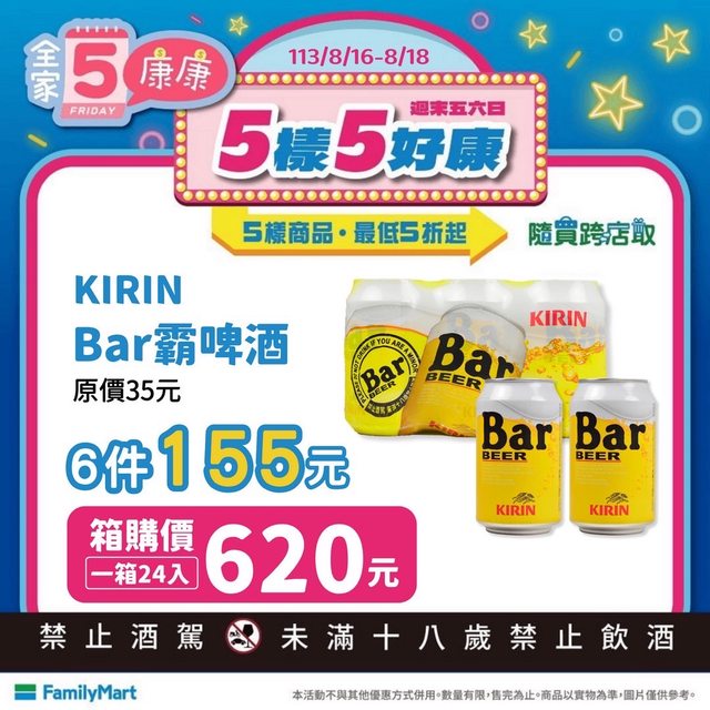 【未滿十八歲禁止飲酒】 【飲酒過量,害人害己】 【酒後不開車,安全有保障】 - 【活動名稱】:5康康 【便利商店/廠商名稱】:全家 【活動時間】:2024/08/16~2024/08/18 【活動內容】: