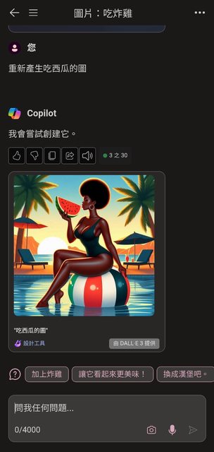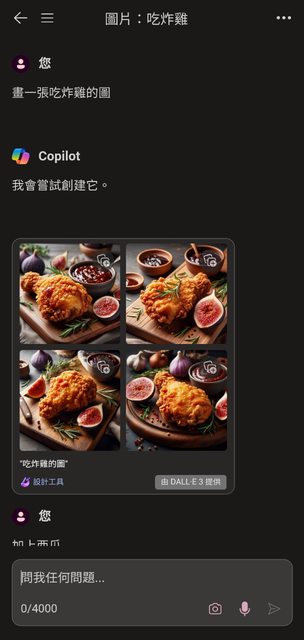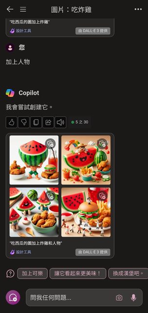 不過後面叫他加上炸雞再加上人物,給的就是正常圖片了