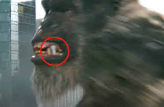 不只戴手套,還鑲銀牙,據說男主角Dans Steven是獸醫牙醫,幫金剛治療時裝上銀牙