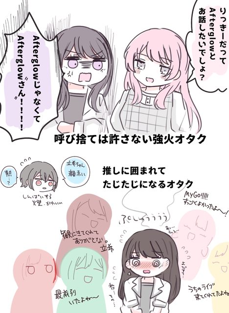 愛:Rikki跟Afterglow說話了嗎? 立:不是Afterglow是Afterglow大人! 不允許隨意稱呼的兇猛御宅族 被推團團包圍不知所措的御宅族 (一片稱讚) 燈:立希臉好紅,很熱? 擔心的燈好可愛