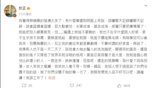 推 Greein: 現在同框被拍到的演員的粉絲都在努力切割,就怕和于正沾01/19 16:26