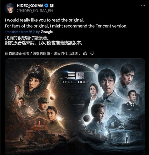 網飛版三體近期全球上線話題熱度高,日本知名遊戲製作人小島秀夫稱讚網飛版三體拍得