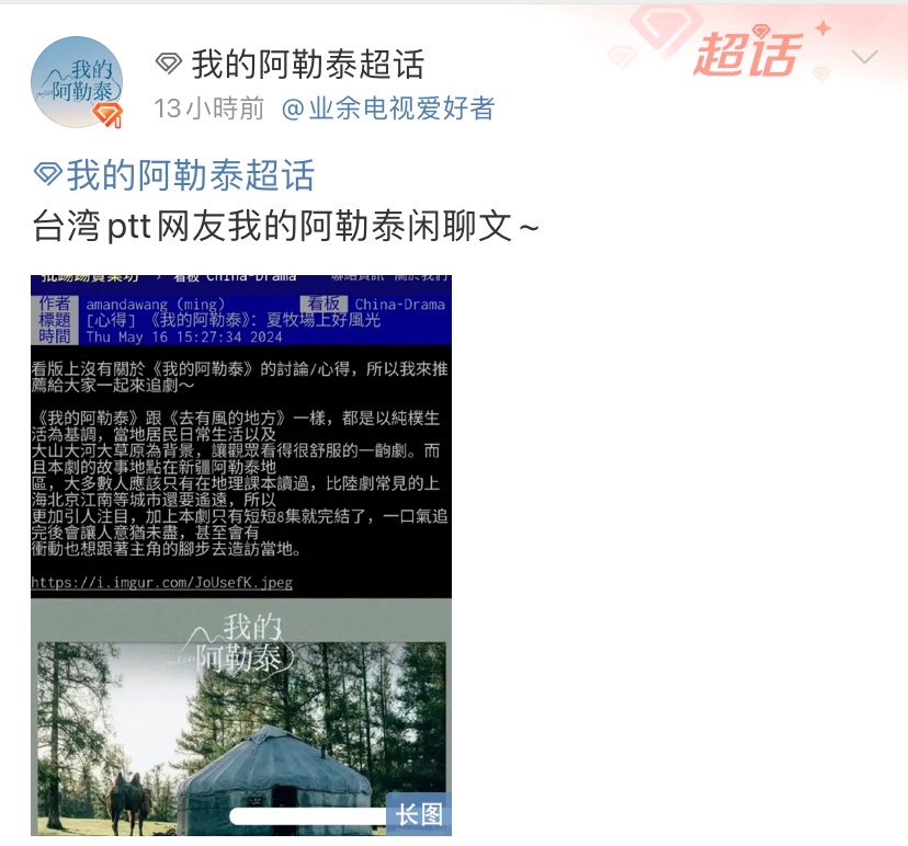 推 amandawang: 滑微博看到我寫的《阿勒泰》心得文po上超話~ 05/26 11:37