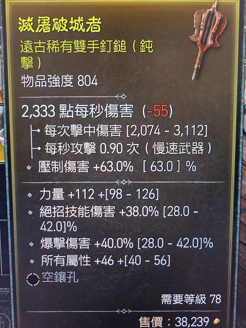 雙手鎚 物品強度804 等級需求78 力/爆傷/全屬