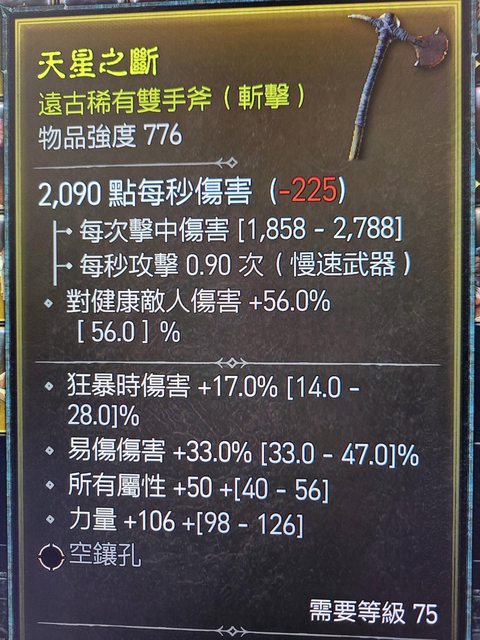 雙手斧 物品強度776 等級需求75 力/易傷/全屬
