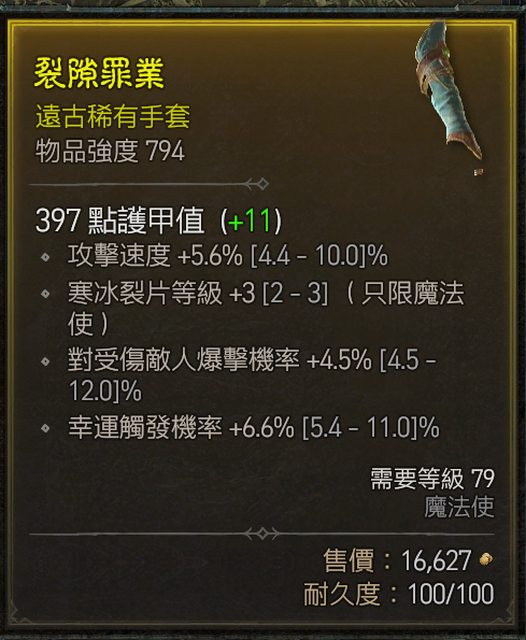 標題[交易] D4 賣 79等法師過渡手套 裂片/攻速/幸運