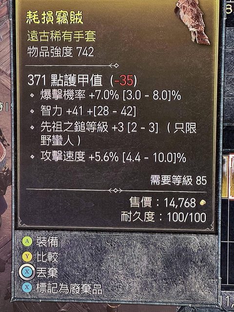 1.先祖+3,爆率,攻速手套,等級=85