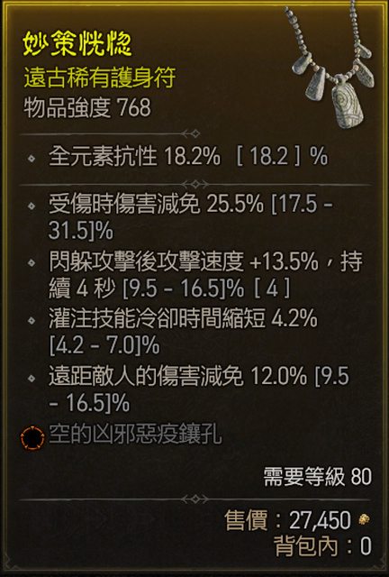 13. 768項鍊橘孔 受傷減傷 遠距離減傷 閃避攻速 灌注冷卻