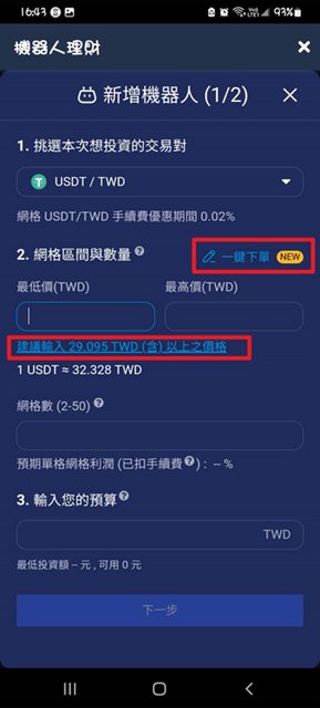 設立的最低價跟最高價,就是網格機器人買低賣高的運行區間