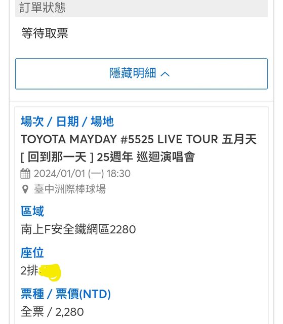 標題[售票] 五月天1/1南上F安全鐵網區*1