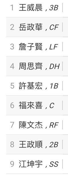 推 joggingwang: 板凳放 志豪 1號 曾頌恩 三支砲不用,排個40歲之只會 08/02 18:12