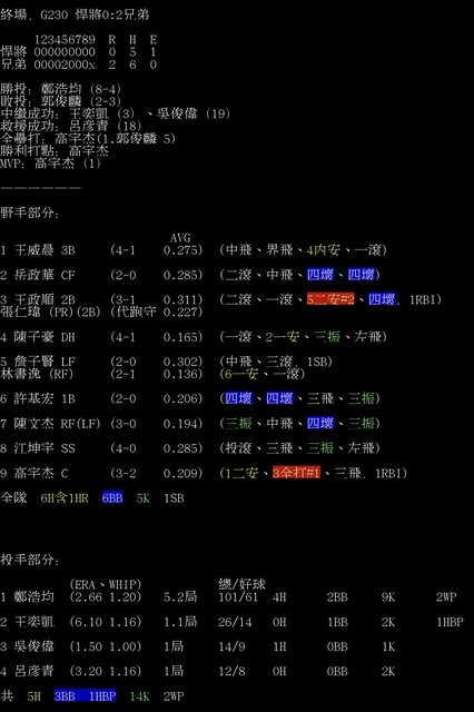 標題[情報] G230 悍將0:2兄弟 全場數據box