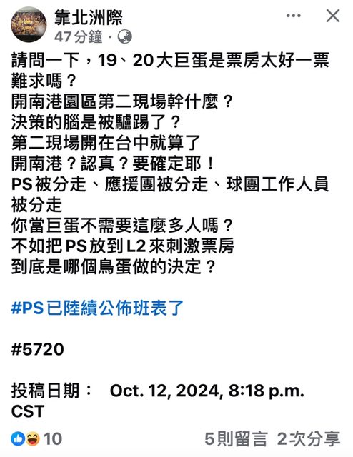推 Starsing1204: PS要支援南港,要也是客場或者是台中洲際主場時吧。 10/13 08:44