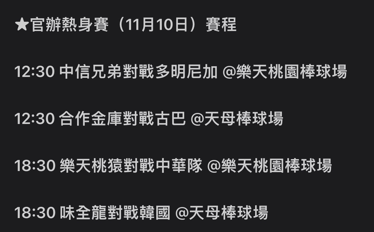 推 jamesk030: 這樣11/9就不會遊行啦,不太可能熱身賽前一天全隊放假 10/30 15:34
