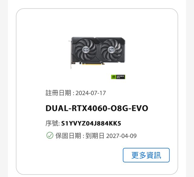 ◎硬體型號:Asus DUAL-RTX4060-08G-EVO