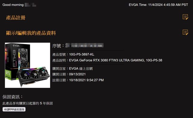 2021/9/13官網排隊購買,保固五年,正常使用無挖礦,無超頻