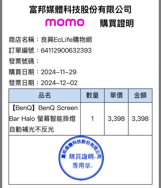 1.購買日期:113年11月29日購入,113年12月3日到貨。