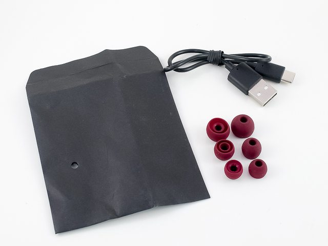 ▼ 配件部分採用黑色的小紙袋包裝,內附 3+1 對不同尺寸的耳塞,另有一條用於充電