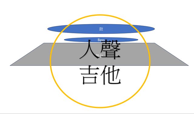 人聲超級宇宙無敵爆炸近,幾乎貼在面前,吉他也很近,但會比人聲後面一點點。