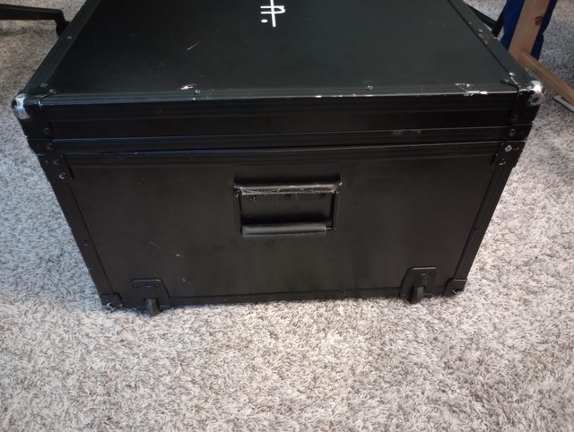 二手的航空箱上佈滿了包材還有貼紙, 外殼為木板和金屬包邊製成, 並附有把手