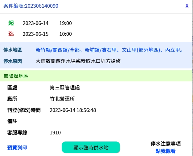 三區處表示,目前已於關西和新埔各里設置臨時供水站,詳細地址請洽台水公司三區處網