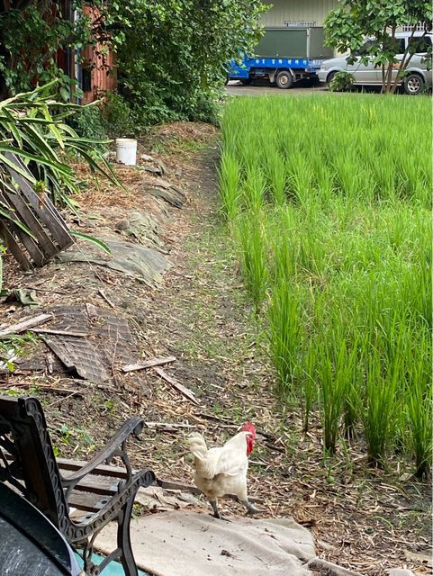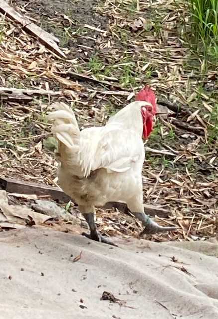 大約兩三週前一隻白色的公雞(右腳有綁綠色緞帶)流浪到東大路三段110巷2弄附近