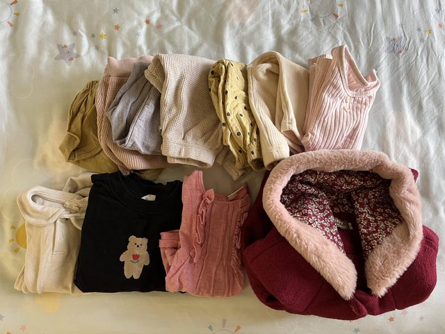 幼兒衣物包含兩件70-80長袖包屁衣、80公分薄長褲多件、80公分粉色薄長袖、80公分粉色短袖睡衣套裝、90公分紅色厚披風。