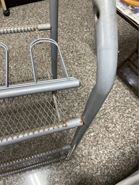 鐵製的還蠻穩固的,不會搖晃。上層立式置物架已拆。久放有灰塵需再細清,鐵管有點生