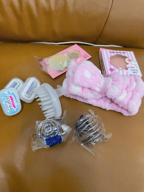 1.粉紅點點美容用髮帶,僅戴過一次,觸感柔軟有彈性