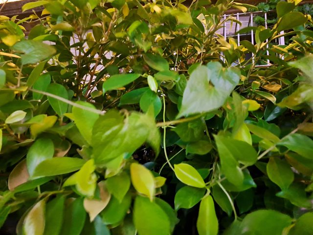 : 心型葉片的小花蔓澤蘭纏在樹叢上
