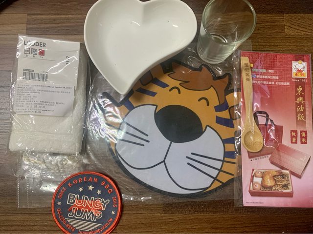 2、杯墊、小盤子、玻璃杯、IKEA方巾、小木湯匙、滑鼠墊