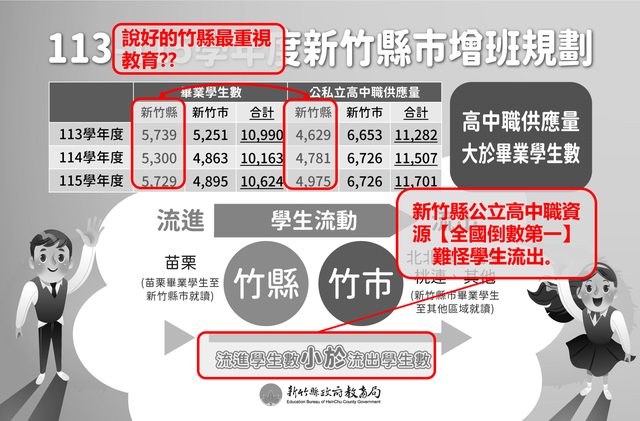 說明新竹縣推動高中職規劃,裡面大玩數字遊戲。