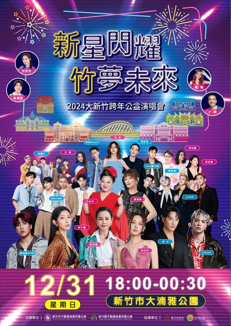 以為新竹沒有跨年晚會,沒想到近期才公佈說要縣市合辦 趕緊來分享一下情報 新星閃耀 竹夢未來 地點:新竹大湳雅公園 時間:2023年12月31日18:00~2024年01月01日00:30 直播平台: 中視新聞FB粉絲專頁、中視新聞YouTube、新竹市長高虹安FB粉絲專頁、新竹縣長楊文科 FB粉絲專頁、新竹縣及新竹市政府FB粉絲專頁 主持:小鐘、梁赫群、何妤玟、圓圓 參與:白冰冰、彭佳慧、安心亞、熊仔、李千娜、張涵雅、婁峻碩SHOU、U:NUS、 Saturnday、艾薇、J.Sheon、張庭瑚、白安、Kevin廖柏雅、同理Zunya、陳思瑋 https://i.imgur.com/337c2oP.jpg